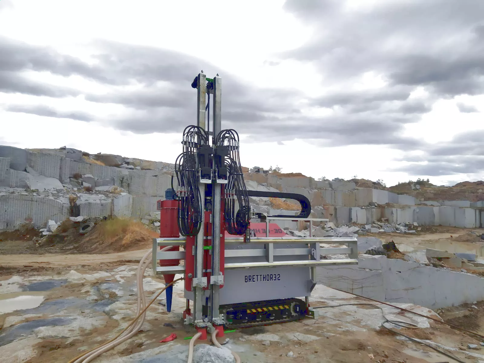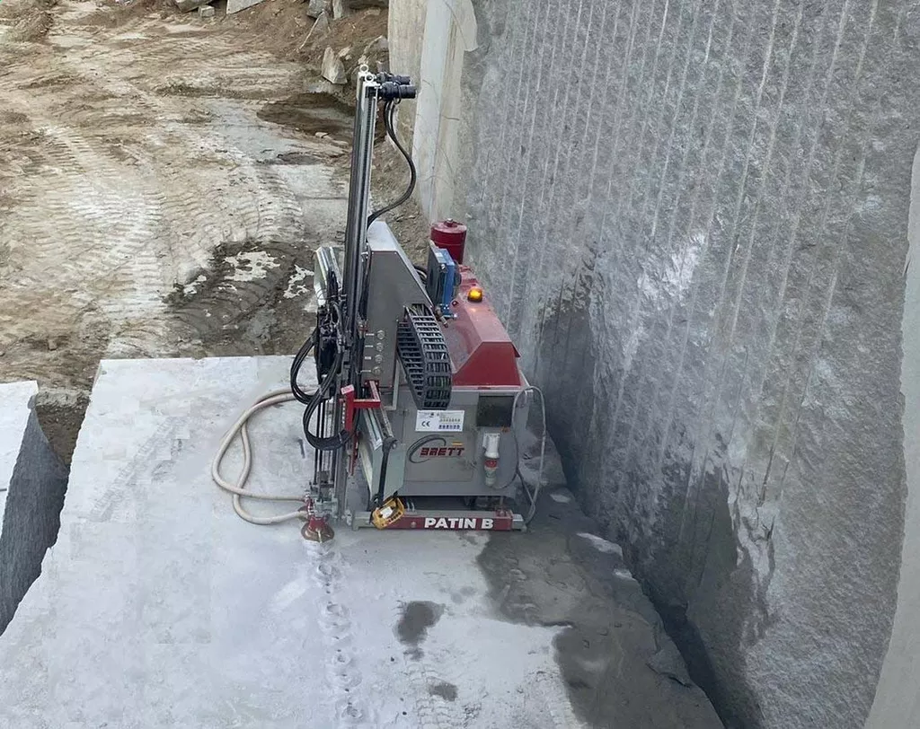 La perforadora banqueadora BRETTHORT 3.2 es un equipo de perforación mediante barrenas, con 2 martillos hidráulicos de alto rendimiento, acoplada a un sistema de transporte por orugas robusto y compacto. Está diseñada para trabajar en canteras de mármol, granito o cualquier otra piedra natural.