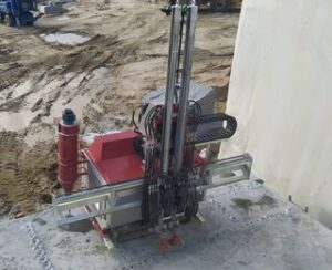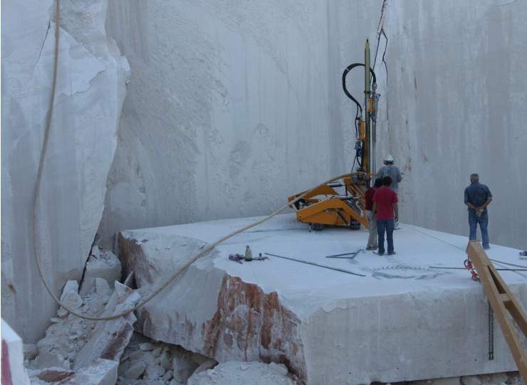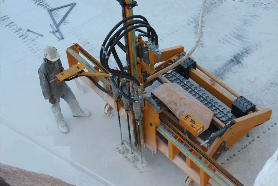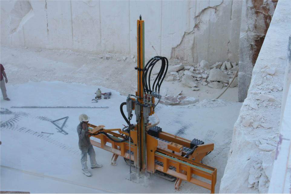 La perforadora banqueadora TM-300 es una máquina de perforación mediante barrenas, con 3 martillos neumáticos de alto rendimiento, acoplada a un sistema de transporte por orugas. Está diseñada para trabajar en canteras de mármol, granito o cualquier otra piedra natural.