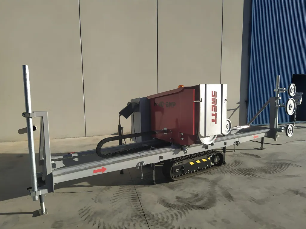 La máquina H-40-BMP es un equipo de corte con hilo diamantado auto transportado, diseñado para realizar cortes pequeños y despuntes de bloques. Es ideal para los trabajos en canteras de rocas ornamentales debido a su movilidad y diseño compacto.