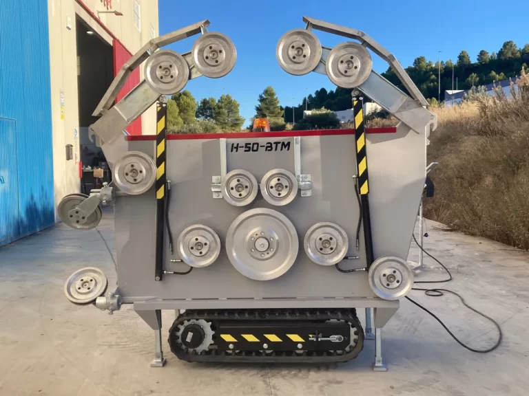 La Máquina de Corte con hilo diamantado H-50-BTM es un equipo auto transportado con mucha autonomía y diseñado para cortar todo tipo de piedras y hormigón. Con un novedoso diseño, compacto y robusto, incorporando un sistema de poleas direccionables que le permite realizar cortes en cualquier dirección.